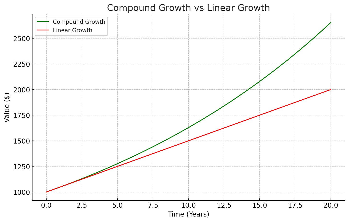 The diagram below illustrates the difference between linear and compound growth. Notice how the compound growth accelerates over time, forming an upward curve.